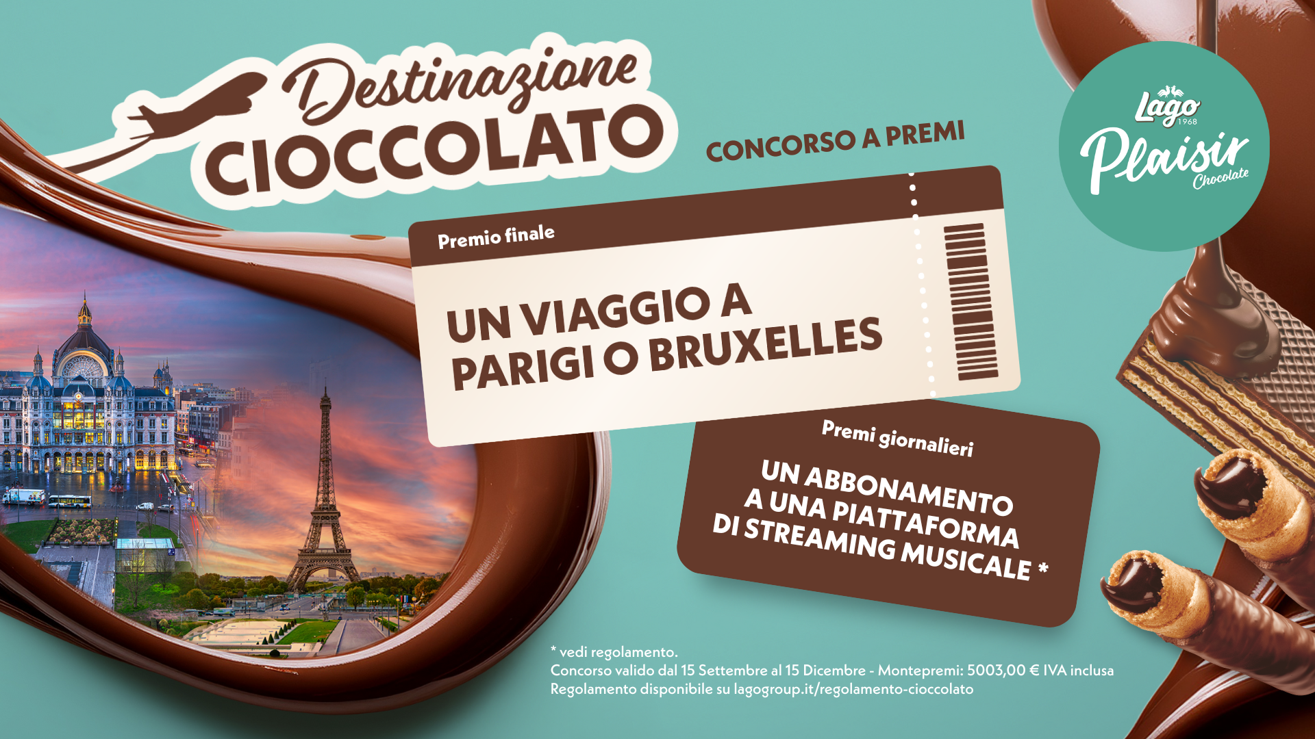Il concorso è pensato per trasformare la visibilità online in azione concreta sullo scaffale. La meccanica è semplice: dal 15 settembre al 15 dicembre 2025, acquistando una confezione di wafer Plaisir Chocolate o Roll wafer Plaisir Chocolate e conservando lo scontrino, si potrà vincere ogni giorno un abbonamento a una piattaforma di streaming musicale valido per 3 mesi dall’attivazione e partecipare automaticamente all’estrazione finale di un weekend per due persone a Parigi o Bruxelles, le capitali europee del cioccolato.