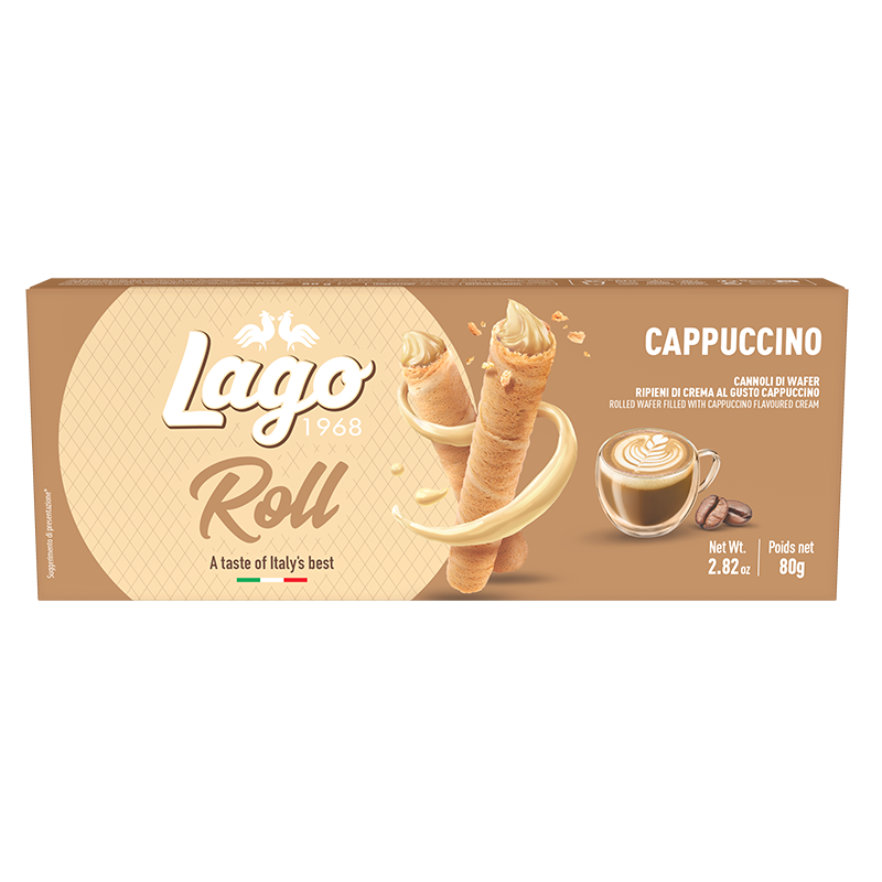 Trade name rolled wafer filled with cappuccino flavoured cream (66%)
