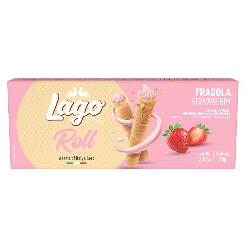 Nome Commerciale Cannoli di wafer ripieni di crema (66%) al gusto fragola Codice articolo 523 Peso 80 g